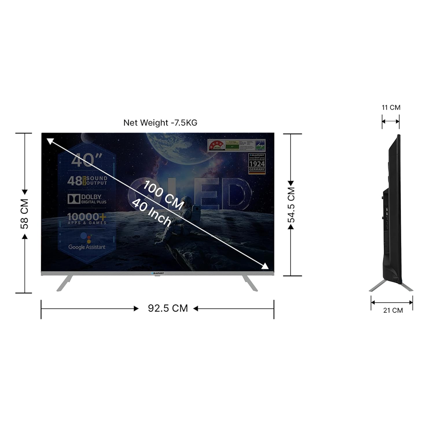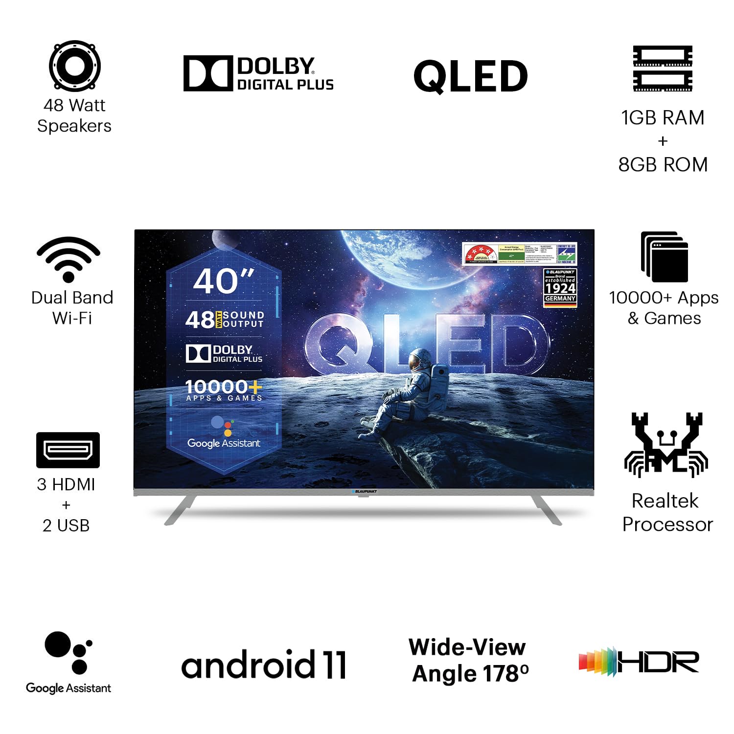 Special Features: Android 11 | QLED | In-Built WiFi | Screen Mirroring | Supported Apps: Netflix, Prime Video, YouTube, etc.| Google Assistant | Energy Rating: 4 Star | Annual Energy Consumption: 47 kWh