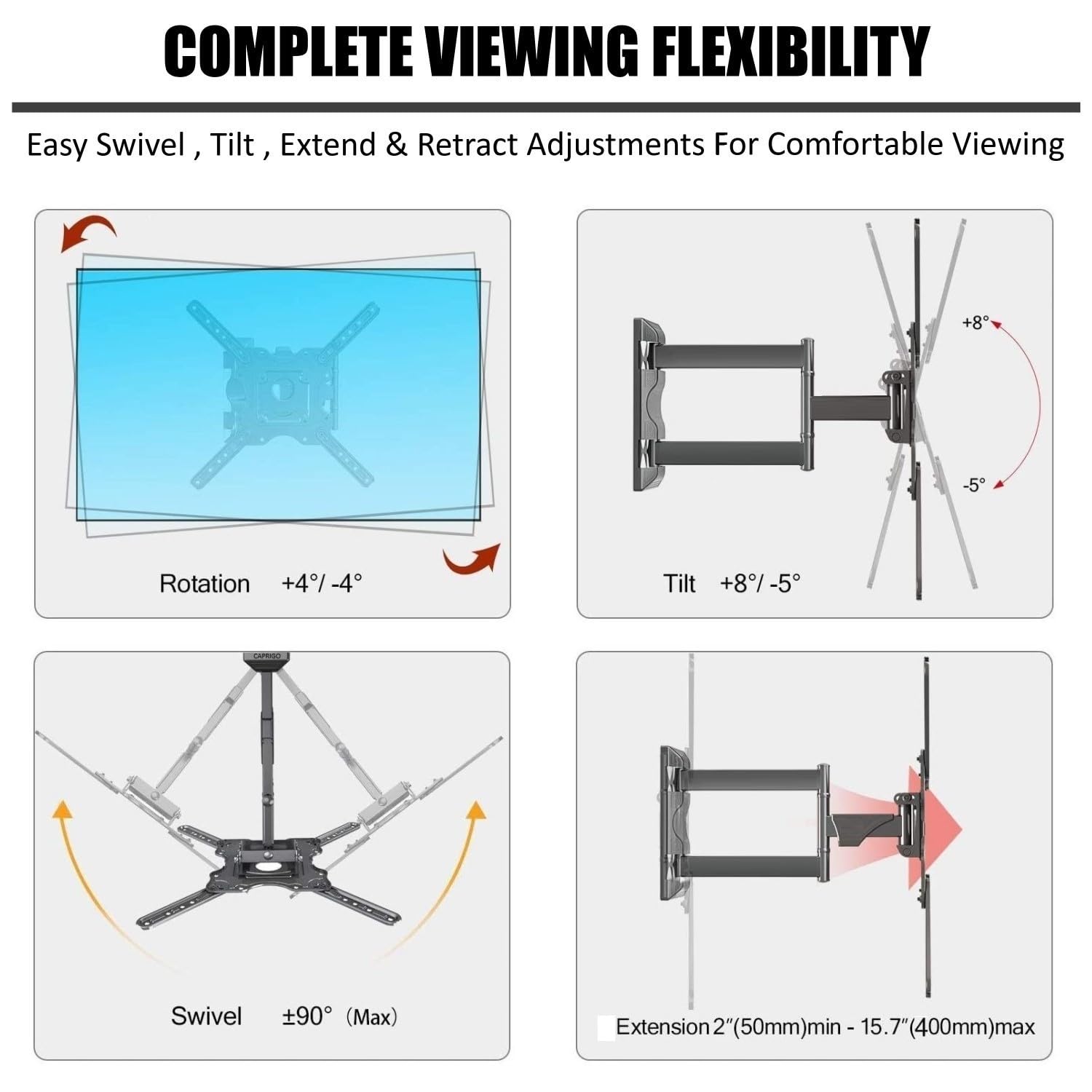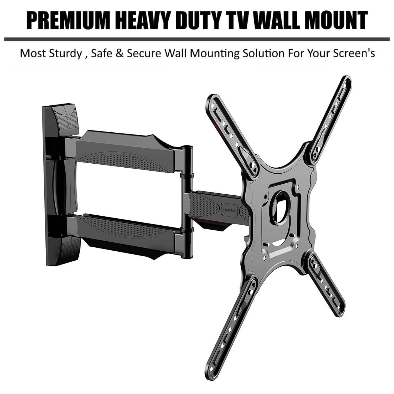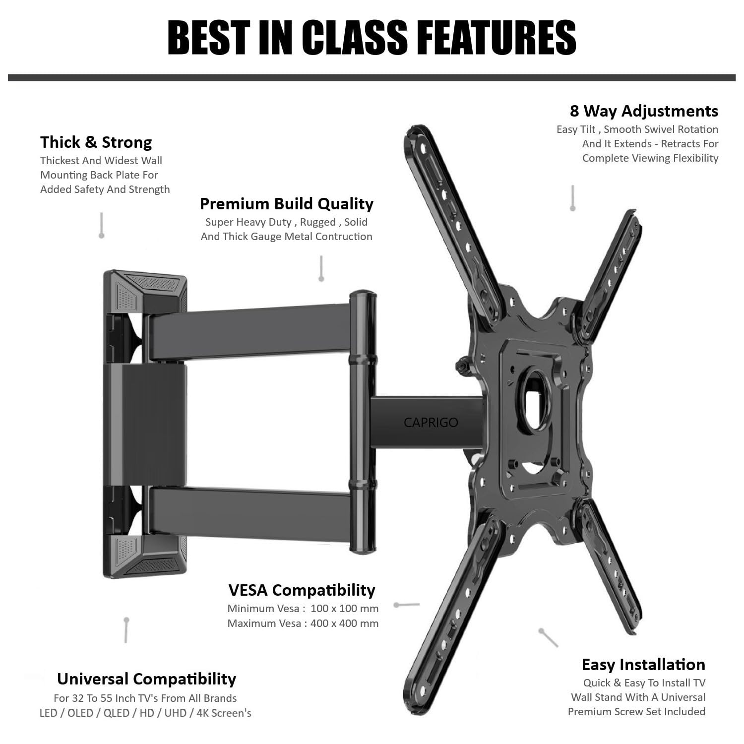Complete Viewing Flexibility : Full Motion Adjustable Caprigo TV Wall Mounting Stand Having The Following Specifications – Tilt Adjustments : +8 /-5° (Up / Down) | Swivel Rotation : +/- 90° (Left / Right) | Maximum Distance From Wall When Extended : 15.7 inch | Minimum Distance From Wall When Retracted : 2 inch
