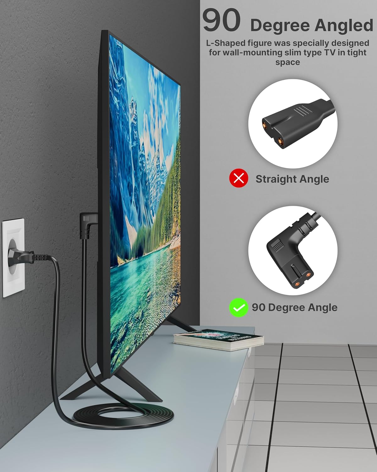 ▶SPACE UTILIZATION AND HUMANIZED DESIGN – The 90 degree angled slot and L-shaped figure 8 was speciallly designed for wall-mounting slim type TV in tight space. With this power cable, you can move your TV as close as possible to the wall meanwhile greatly protect your cord from bending. Powerful, beautiful and generous, it is an excellent choice for your bold innovation.