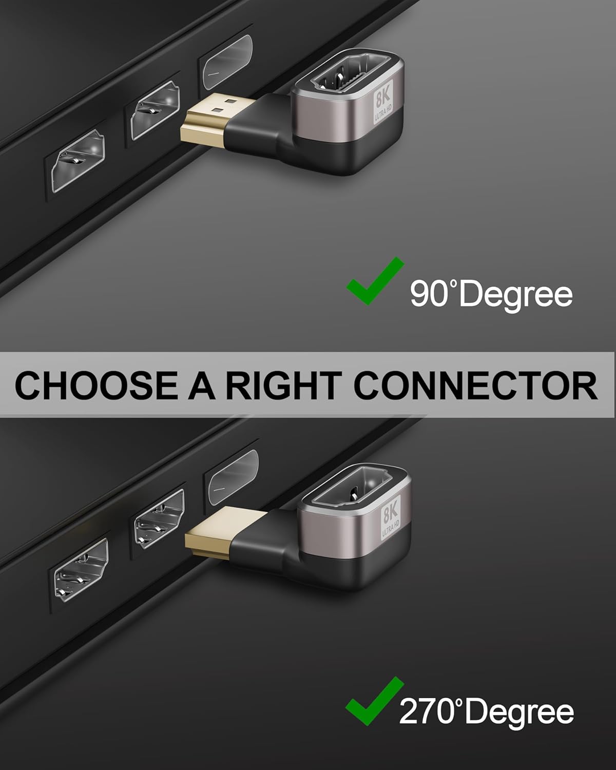 ▶FIT NARROW SPACE: L-Shaped body easily used on any tight spaces between HDMI device and wall; with this combo of 90-degree and 270-degree HDMI adaptor, Direct the cable up or down depending on the orientation of the HDMI port on your equipment, which is super handy for connecting HDMI cables at narrow space; It perfectly protects your cables from bending damage or breakage. Also, it reduces the stress on the ports of your valuable devices.