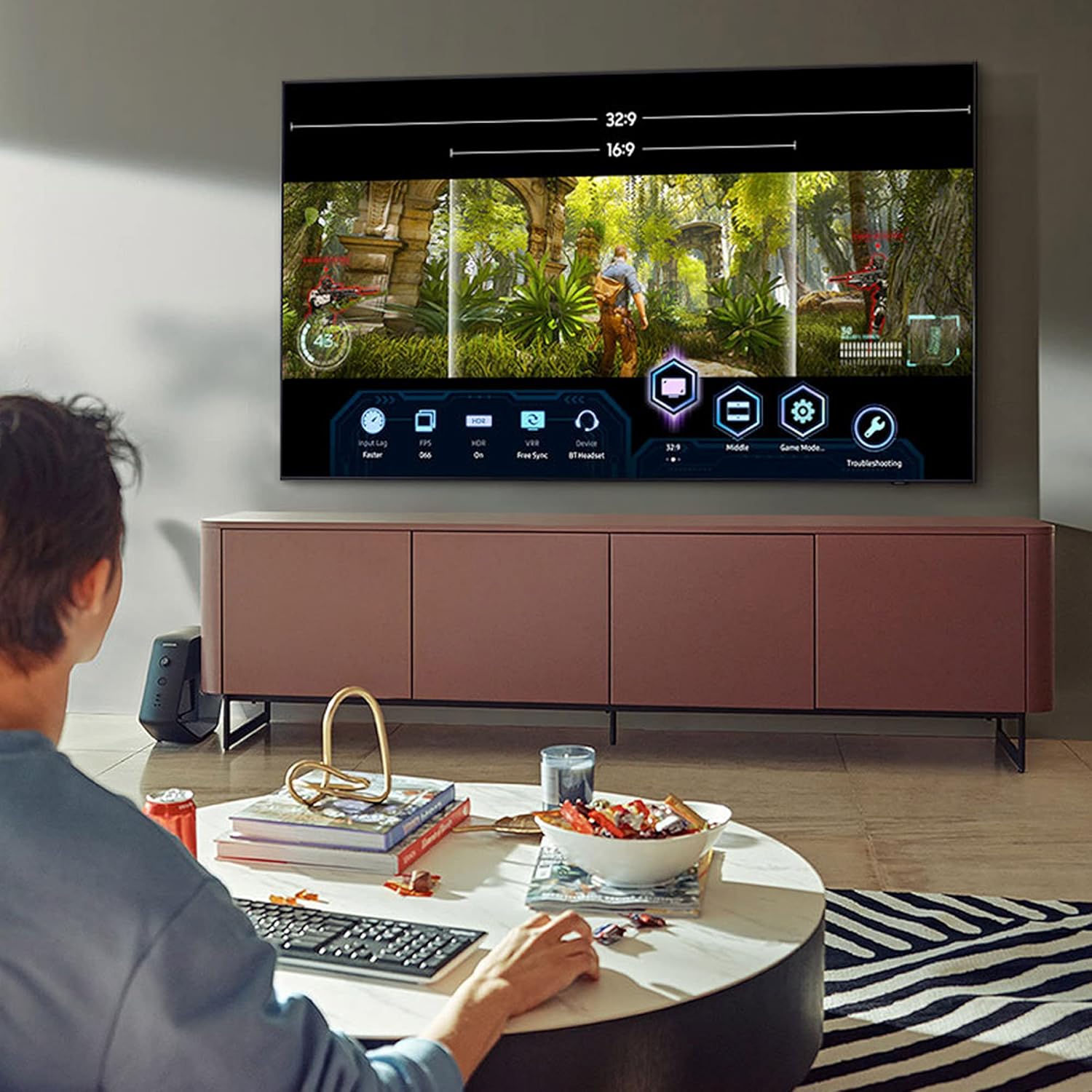 21:9 and 32:9 screen ratios give you the extra viewing area you need to maximize the gaming experience—and to win. Optimize your gameplay with Game Bar, an on-screen menu that lets you make real-time adjustments to screen ratio, input lag check, FPS, HDR, wireless headset settings and more. Super UltraWide GameView is available for ultra wide supported games and PC games only. Some game titles may not support or be limited in the use of this function. Screen resolution change from external device may be required. Not available in Q60A 32′