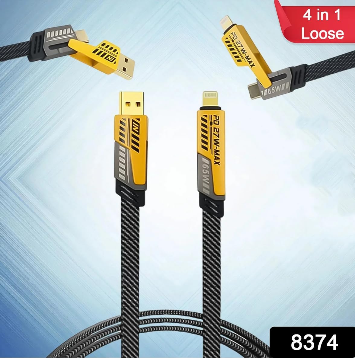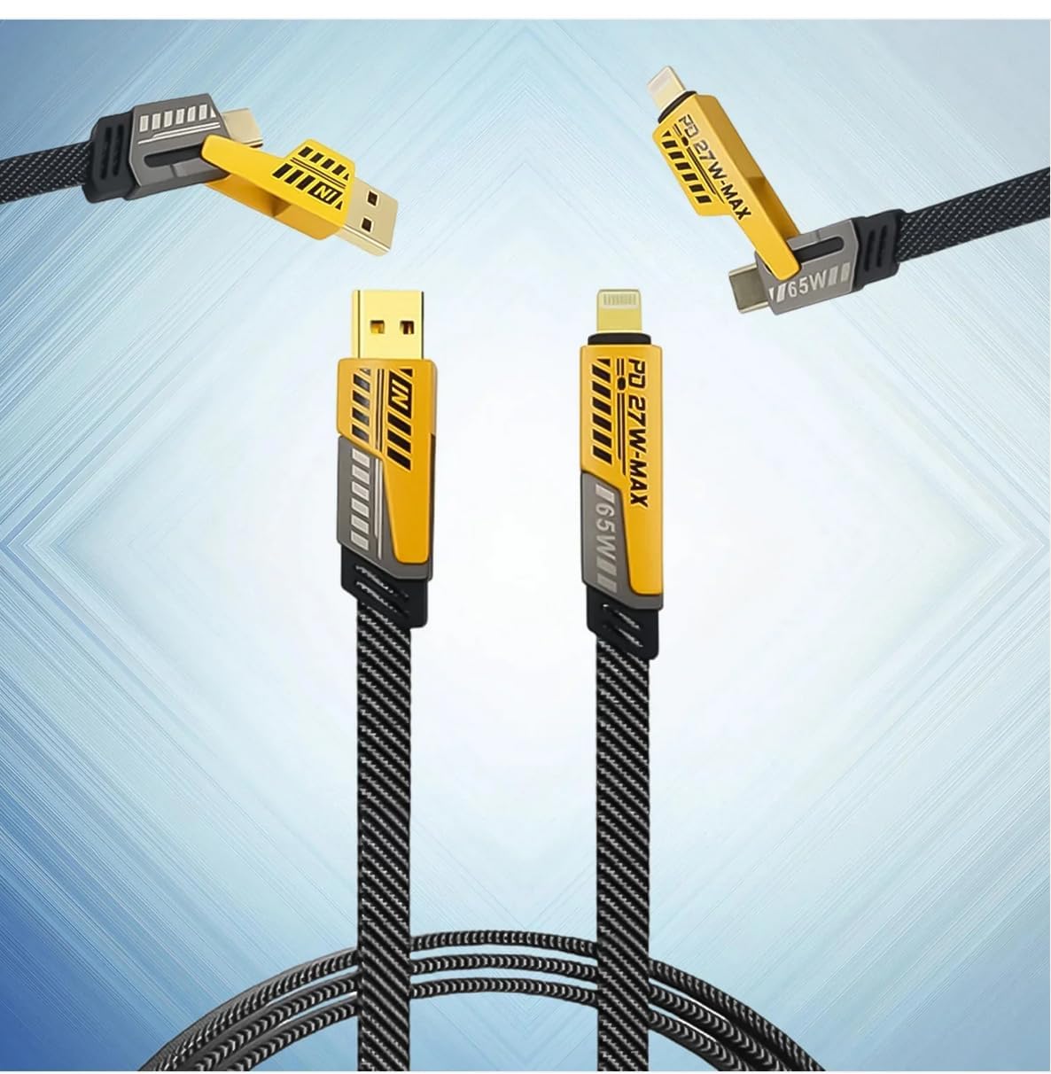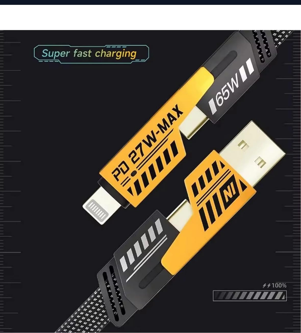 The 65W Fast Charging Cable is designed with a unique 4-in-1 connector that combines both USB-C and Lightning outputs, making it a perfect choice for users with multiple devices. Whether you’re charging your iPhone, Android phone, iPad, tablet, or power bank, this cable has you covered. It eliminates the need to carry multiple cables and ensures you’re always ready to connect, no matter the device.