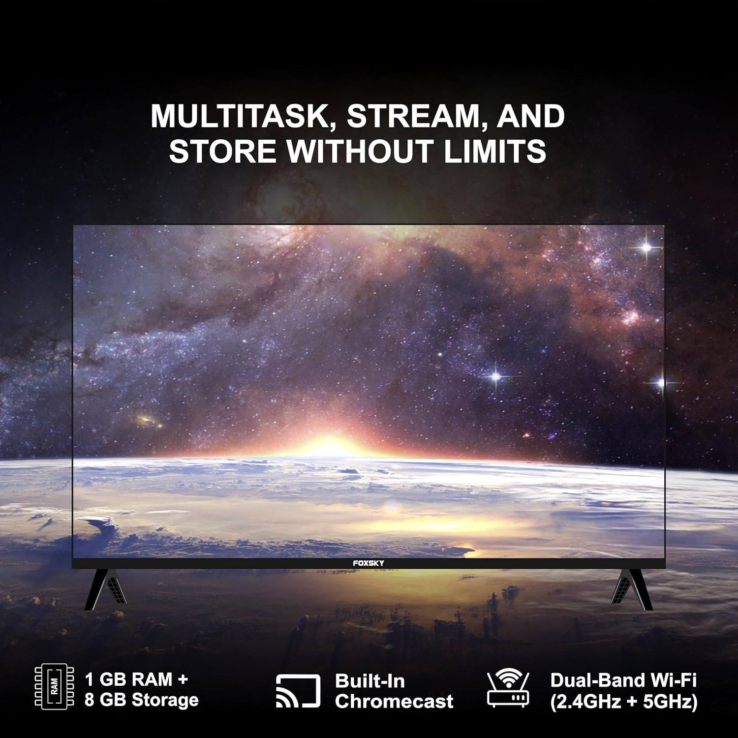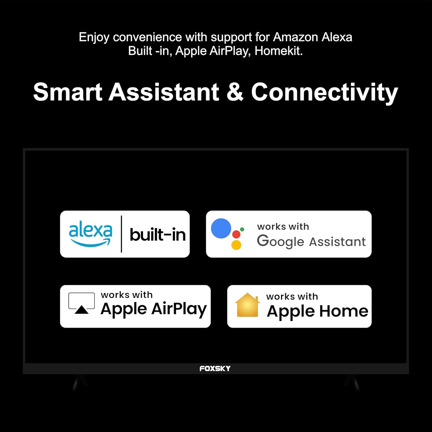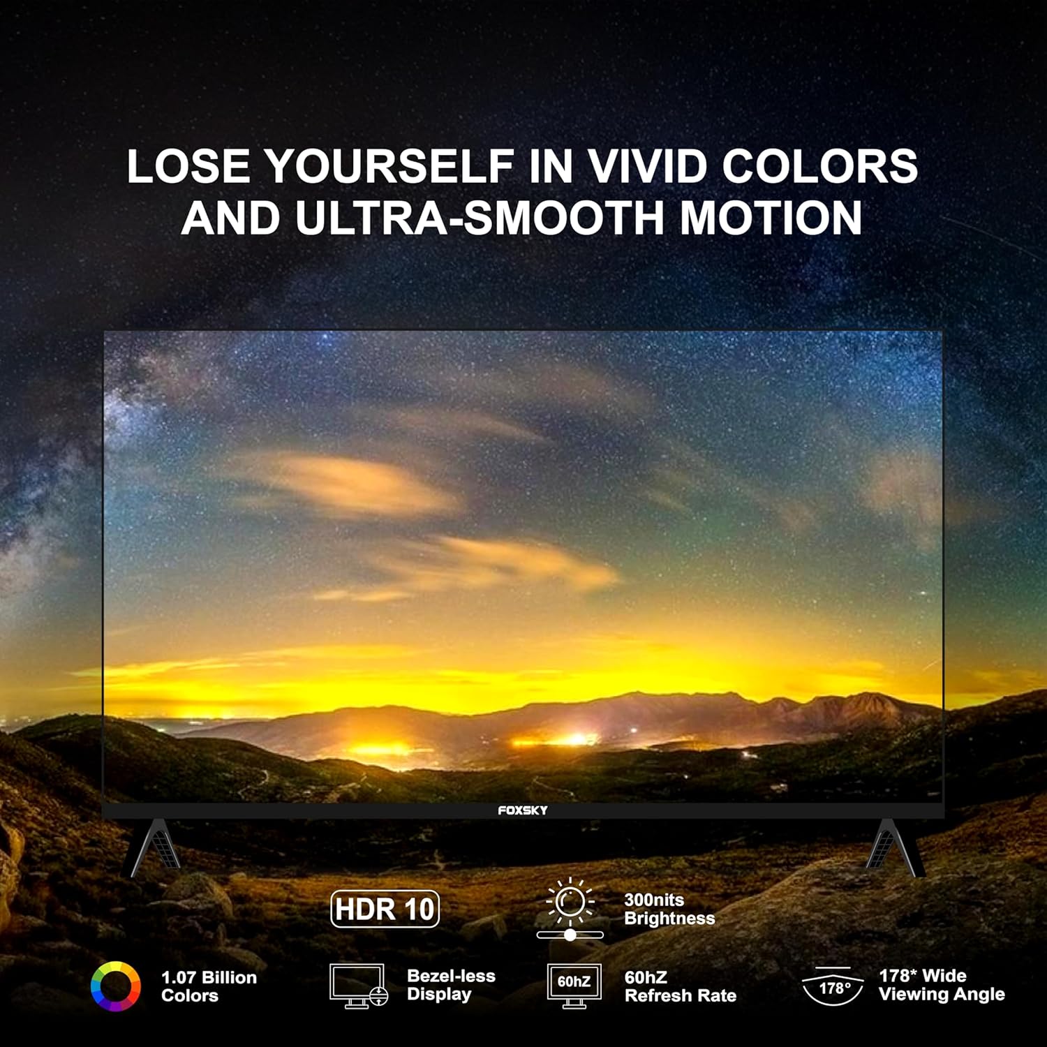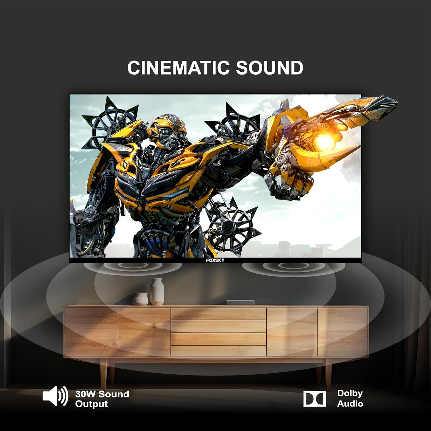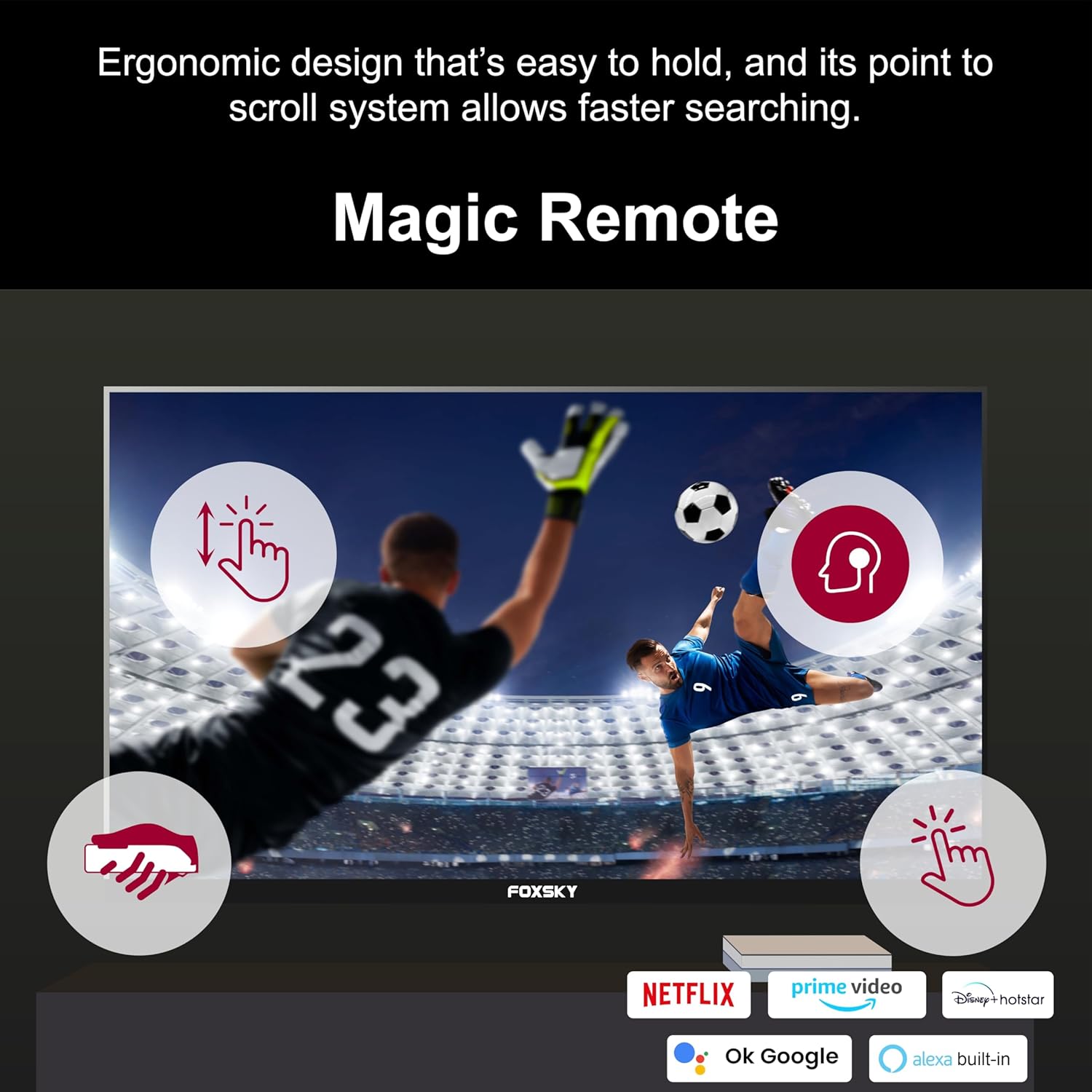 <br>Resolution: 4K Ultra HD (3840x2160) | Refresh Rate: 60 Hertz | Viewing Angle: 178 Degrees;Connectivity: 3 HDMI ports to connect latest gaming consoles, set-top box, Blu-ray Players | 2 USB ports to connect hard drives and other USB devices | Alexa Built-in | ALLM | MEMC | 2 Way Bluetooth 5.0 | Dual Band Wi-Fi | Optical Output | HDR 10 | HLG<br>Connectivity: 2 HDMI Ports to connect set top box, Blu Ray players, gaming console | 2 USB ports to connect hard drive or other USB device | Ethernet | Wi-fi | Bluetooth | 1 Headphone output<br>Sound: 30 Watts Output | Dolby Audio | DTS Virtual : X<br>Smart TV Features | Magic Remote | Intelligent Edit | Universal Control via Magic Remote to Control Connected Devices | Miracast | 1GB Ram | 8 GB Rom | Supported Apps Netflix, YouTube, Prime Video, Disney+ Hotstar, SonyLiv, Zee5 etc.| Personalised Picture and Sound Settings within Apps | Annual Energy Consumption: 51 kWh/Year<br>Display: 4K HDR | HDR10+ | HLG | Reality Flow MEMC | Vivid Picture Engine 2 | DCI P3 94% (typ) NTSC 88% (typ)<br>Warranty Information: 1-Year Foxsky India Standard Warranty on Product from the date of purchase (T&C Apply) and six months standard warranty on the remote control (only for technical defects in the remote controller) Warranty claims can be processed using the Amazon e-invoice