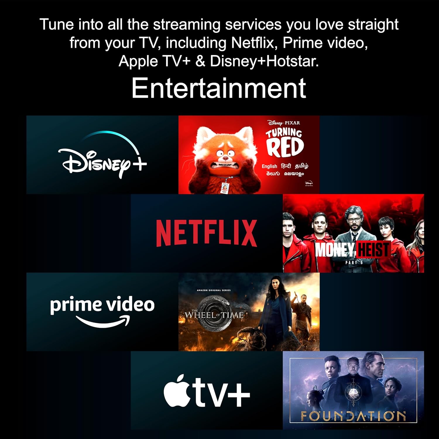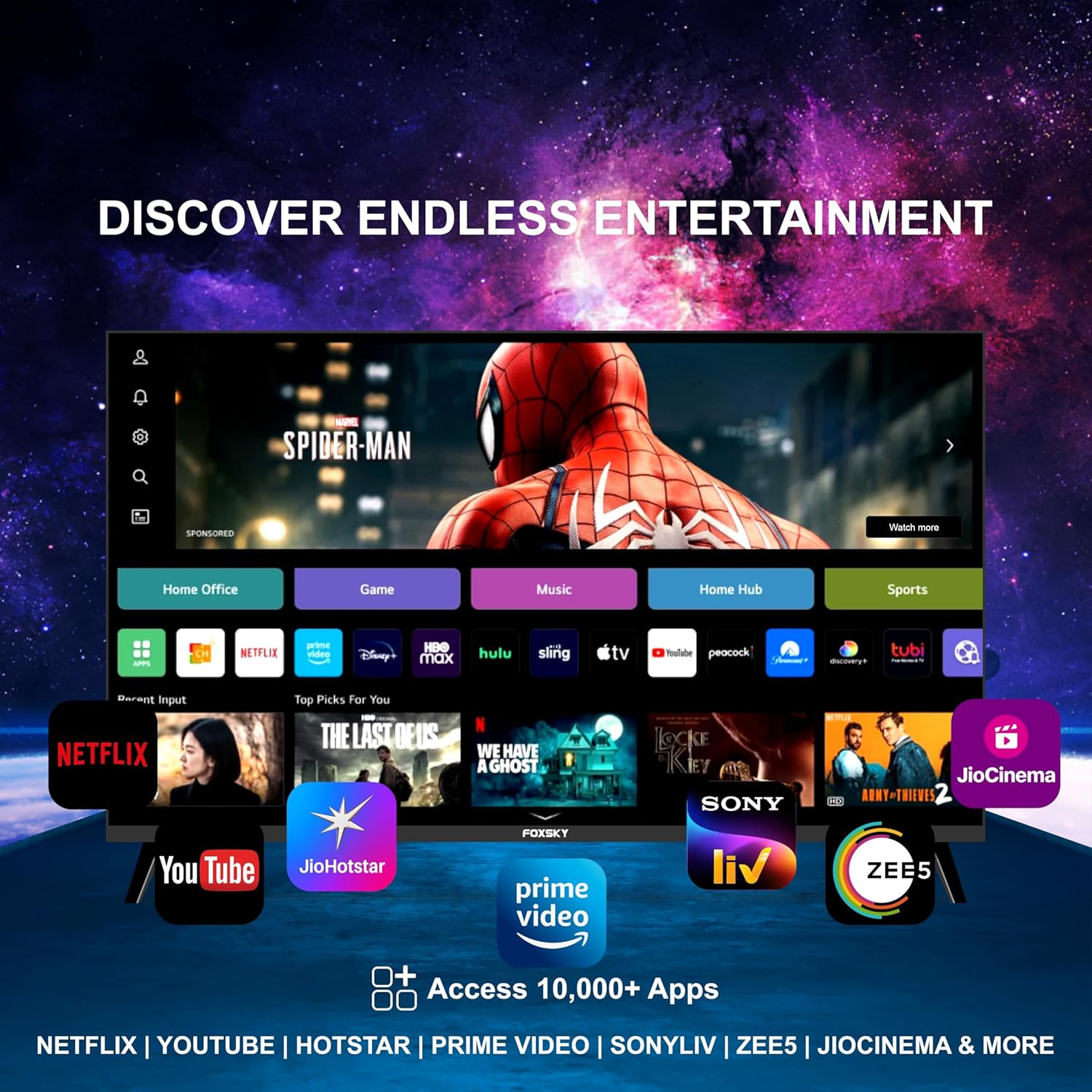 Access Thousands of Shows with WebOS TV Watch over 1 million streaming movies and TV episodes with access to 500+ channels, apps, and Alexa skills, including Prime Video, Netflix, YouTube, Disney+, JioCinema, Hungama, SonyLiv, and other apps you can use in this Foxsky Webos 109 cm (43) TV. </p>