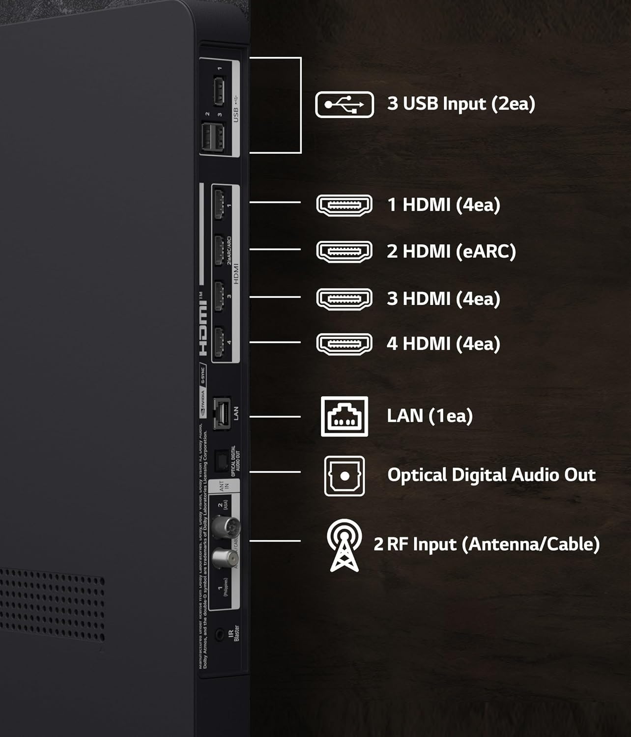 Connectivitiy: 4 HDMI ports (supports 4K 120Hz, eARC, VRR, ALLM, QMS) | Simplink (HDMI CEC) | HDMI Audio Return Channel (HDMI 2) | 3 USB Input (v 2.0) | Wi-Fi (6) | Bluetooth Support (v 5.3) | 1 Ethernet Input (LAN) | 2 RF Input (Antenna/Cable) | 1 SPDIF (Optical Digital Audio Out) | IR Blaster