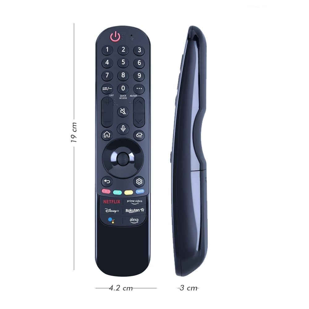 The Original MR22GA and MR21GA Magic Remote for LG Smart TVs is a premium-quality replacement designed to deliver the same convenience and functionality as the original LG remote. It is compatible with multiple LG Smart TV models, including those using remote codes AKB76039908 and AKB76036207, ensuring smooth pairing and flawless operation. This replacement remote provides full access to your TV’s smart features, including voice control and motion pointer capabilities, for a complete and immersive viewing experience. Featuring advanced voice recognition technology, the remote allows you to search for shows, adjust settings, and control your TV using simple voice commands through Google Assistant or Alexa (depending on your TV model). The pointer and scroll function works like a computer mouse, making menu navigation and app browsing effortless and precise. The remote is designed with high-quality materials for durability and long-term use. Its ergonomic shape fits comfortably in your hand, while the well-spaced, responsive buttons provide smooth operation and quick access to all TV functions — including power, volume, home, input source, streaming apps, and navigation controls. Setup is quick and easy — just pair the remote with your LG Smart TV following the on-screen instructions. No extra programming is required. Perfect for replacing lost or damaged remotes, the LG MR22GA and MR21GA Magic Remote ensures you regain full control of your Smart TV experience with all the original features, reliable performance, and intuitive operation you expect from LG.