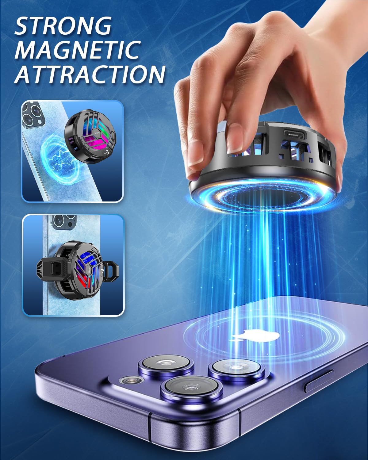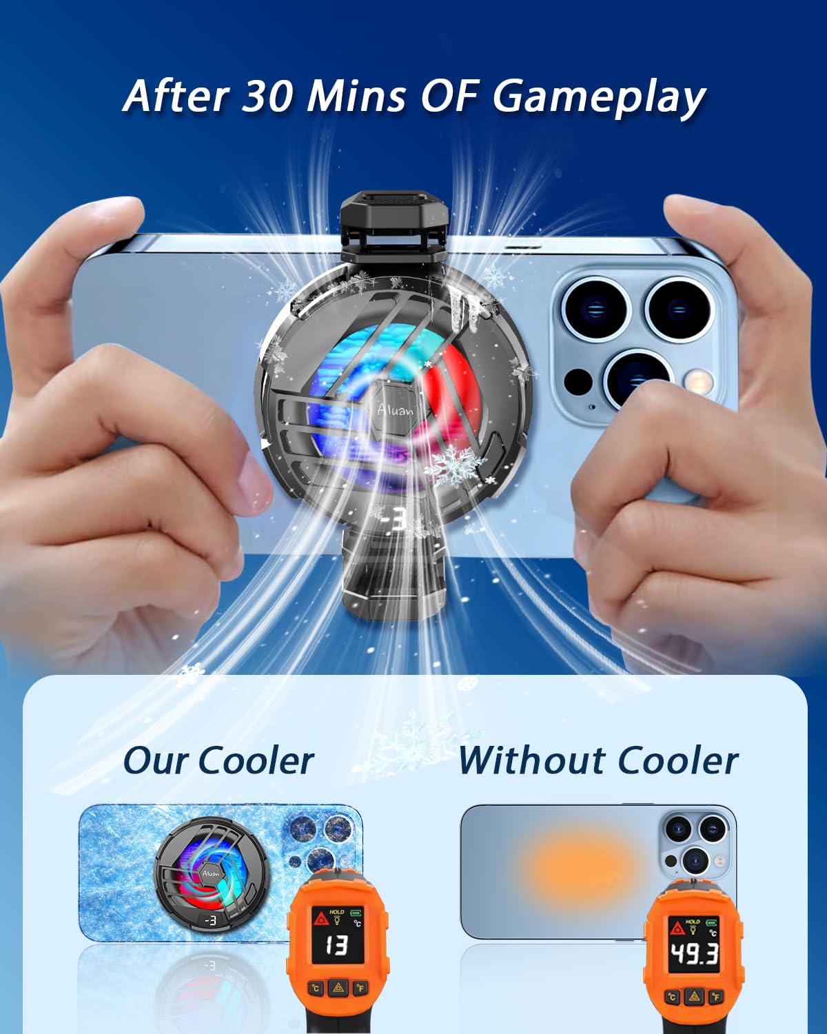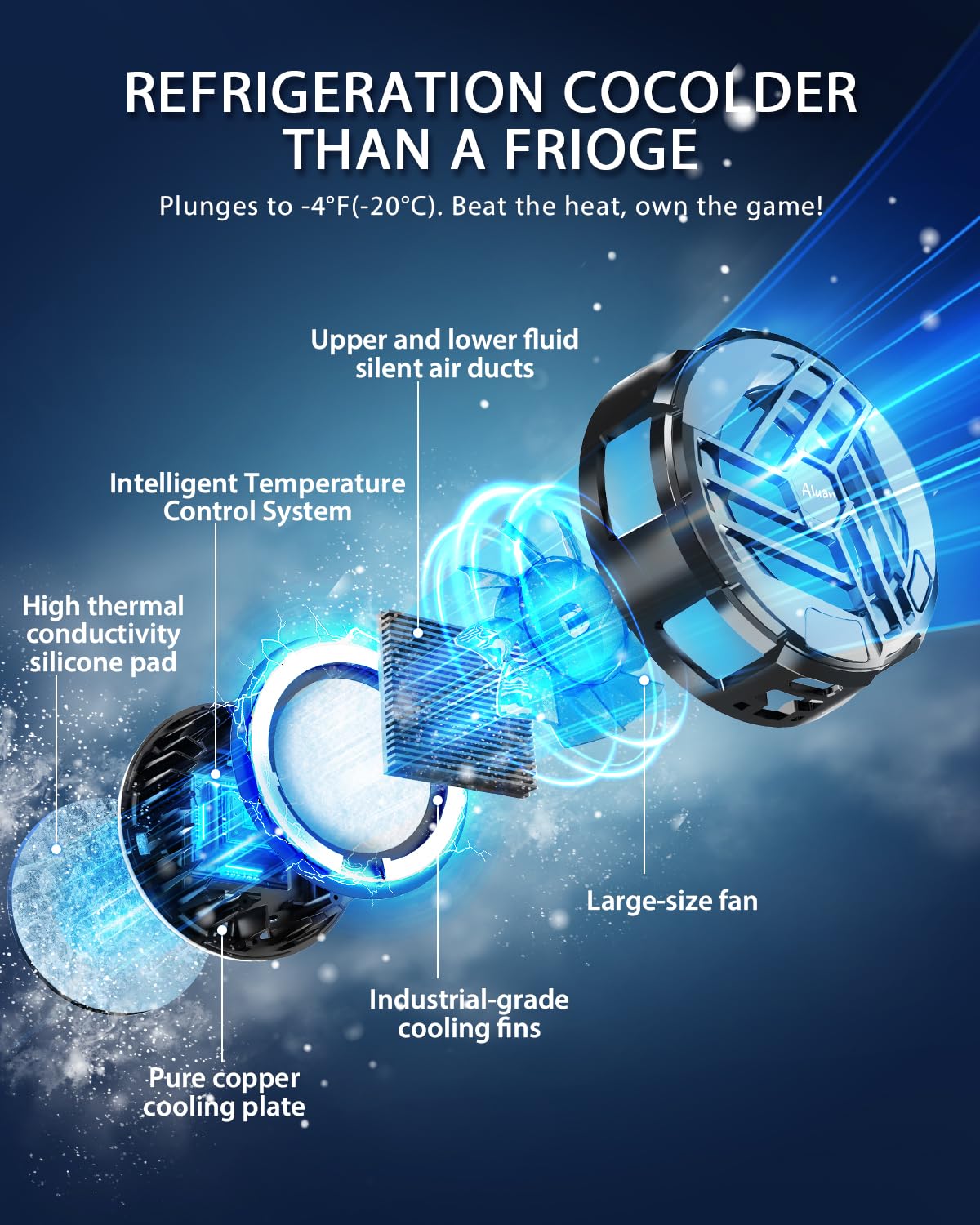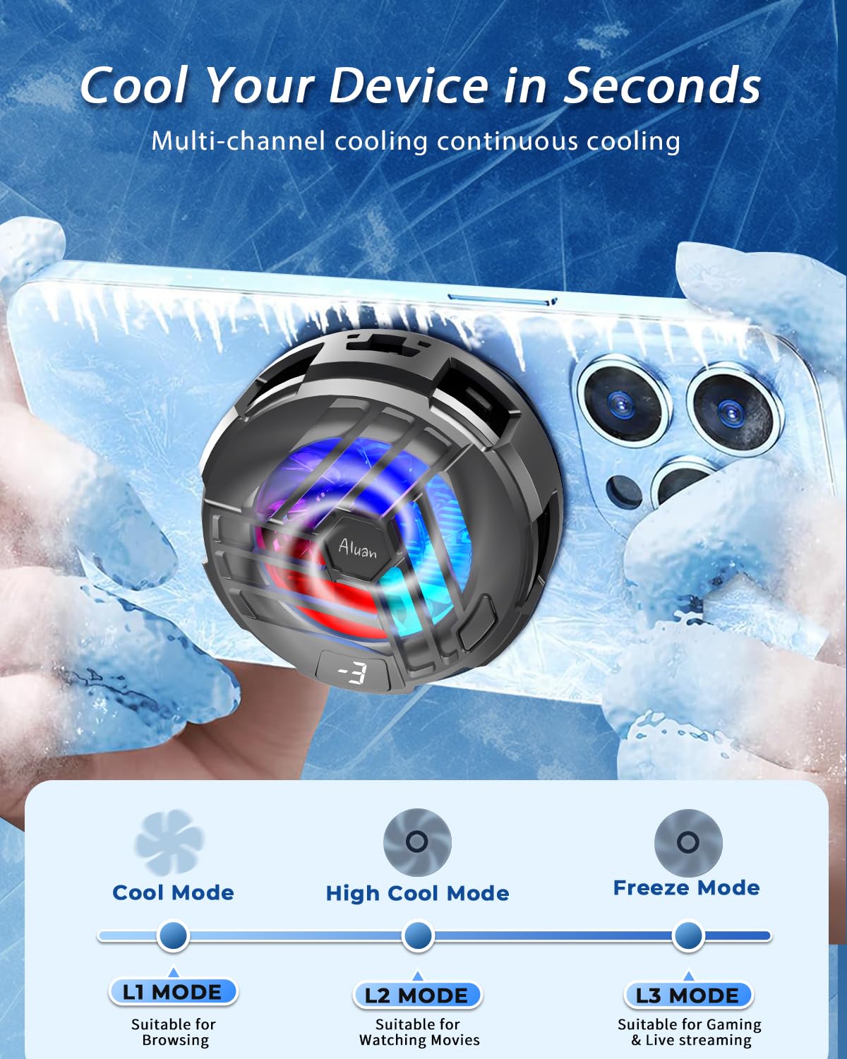 <br> Product Dimensions                                            ‏                                            :                                            ‎                                            15 x 10 x 3 cm; 80 g   <br> ASIN                                            ‏                                            :                                            ‎                                            B0FF4JCJ53   <br> Country of Origin                                            ‏                                            :                                            ‎                                            China   <br> Manufacturer                                            ‏                                            :                                            ‎                                            Aluan   <br> Packer                                            ‏                                            :                                            ‎                                            Aluan   <br> Importer                                            ‏                                            :                                            ‎                                            Aluan   <br> Item Weight                                            ‏                                            :                                            ‎                                            80 g   <br> Item Dimensions LxWxH                                            ‏                                            :                                            ‎                                            15 x 10 x 3 Centimeters   <br> Included Components                                            ‏                                            :                                            ‎                                            manual   <br> Generic Name                                            ‏                                            :                                            ‎                                            F121   <br>       Best Sellers Rank:  #11,594 in Electronics (See Top 100 in Electronics)    #50 in Mobile Gaming Accessories      <br>  Customer Reviews:                                                                                     4.0             4.0 out of 5 stars                                    73 ratings                                             var dpAcrHasRegisteredArcLinkClickAction;                    P.when('A', 'ready').execute(function(A) {                        if (dpAcrHasRegisteredArcLinkClickAction !== true) {                            dpAcrHasRegisteredArcLinkClickAction = true;                            A.declarative(                                'acrLink-click-metrics', 'click',                                { "allowLinkDefault": true },                                function (event) {                                    if (window.ue) {                                        ue.count("acrLinkClickCount", (ue.count("acrLinkClickCount") || 0) + 1);                                    }                                }                            );                        }                    });                                             P.when('A', 'cf').execute(function(A) {                A.declarative('acrStarsLink-click-metrics', 'click', { "allowLinkDefault" : true },  function(event){                    if(window.ue) {                        ue.count("acrStarsLinkWithPopoverClickCount", (ue.count("acrStarsLinkWithPopoverClickCount") || 0) + 1);                    }                });            });                          <br><br>Specifically designed as a phone cooler for gaming, it tackles the heat generated by demanding games, ensuring smooth gameplay, faster charging, and protecting your device's battery health.<br>The phone cooler has a built-in magnetic design to ensure a secure fit and instant cooling for the iPhone 12-15 series, providing efficient heat dissipation during gaming.<br>Easily choose the perfect cooling intensity (Low/Medium/High) with the intuitive 3-speed control. The bright LED display clearly shows the active fan speed at a glance.<br>The semiconductor heat dissipation chip enables this powerful mobile cooler to dissipate heat quickly, preventing overheating and frequency reduction, maintaining optimal performance even after long-term use, and experience lag-free gaming on your phone!<br>The heat sink's noise-reducing design allows you to watch games and videos comfortably. Due to its ultra-quiet sound, it is also recommended for voice chats and live streaming.