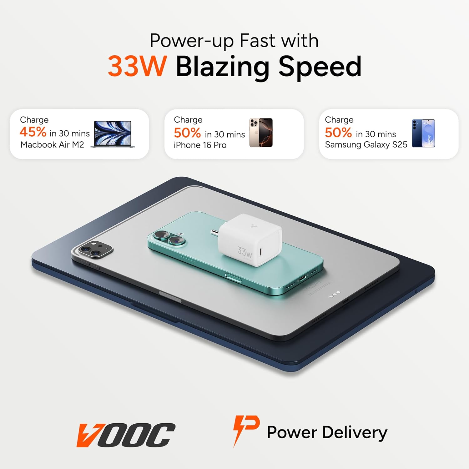 <br>33W BoostedSpeed: Enjoy 33W super-fast charging with minimum wait, sufficient for all your essential devices.<br>Macbook Charging Supported: No need to carry a separate charger for your Macbook, power it up with a compact GaN charger!<br>GaN Technology: Powered by GaN, this charger stays cool, charges faster, and gives you unmatchable power into a compact size.<br>Wide Compatibility: Carry a single charger for a variety of devices, from android smartphones to Macbook, Charge33 is all you need.<br>Compact and Portable: Carry it along anywhere, it’s conveniently compact & portable, perfect for everyday use or travelling without compromising on power.