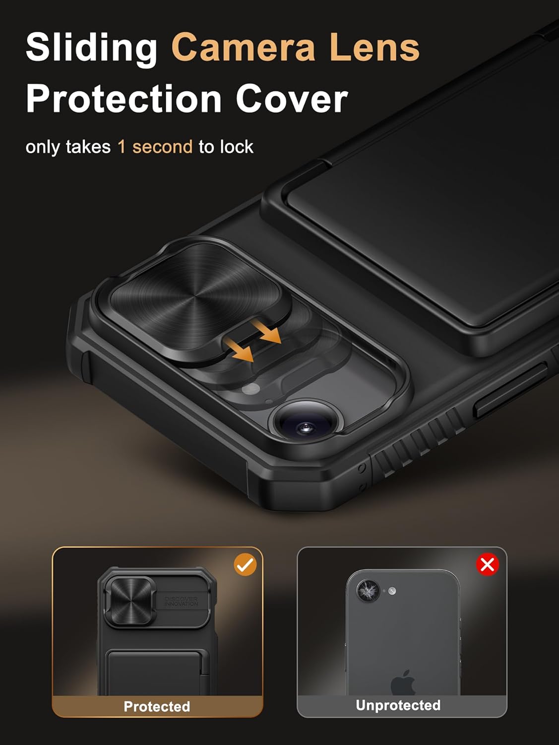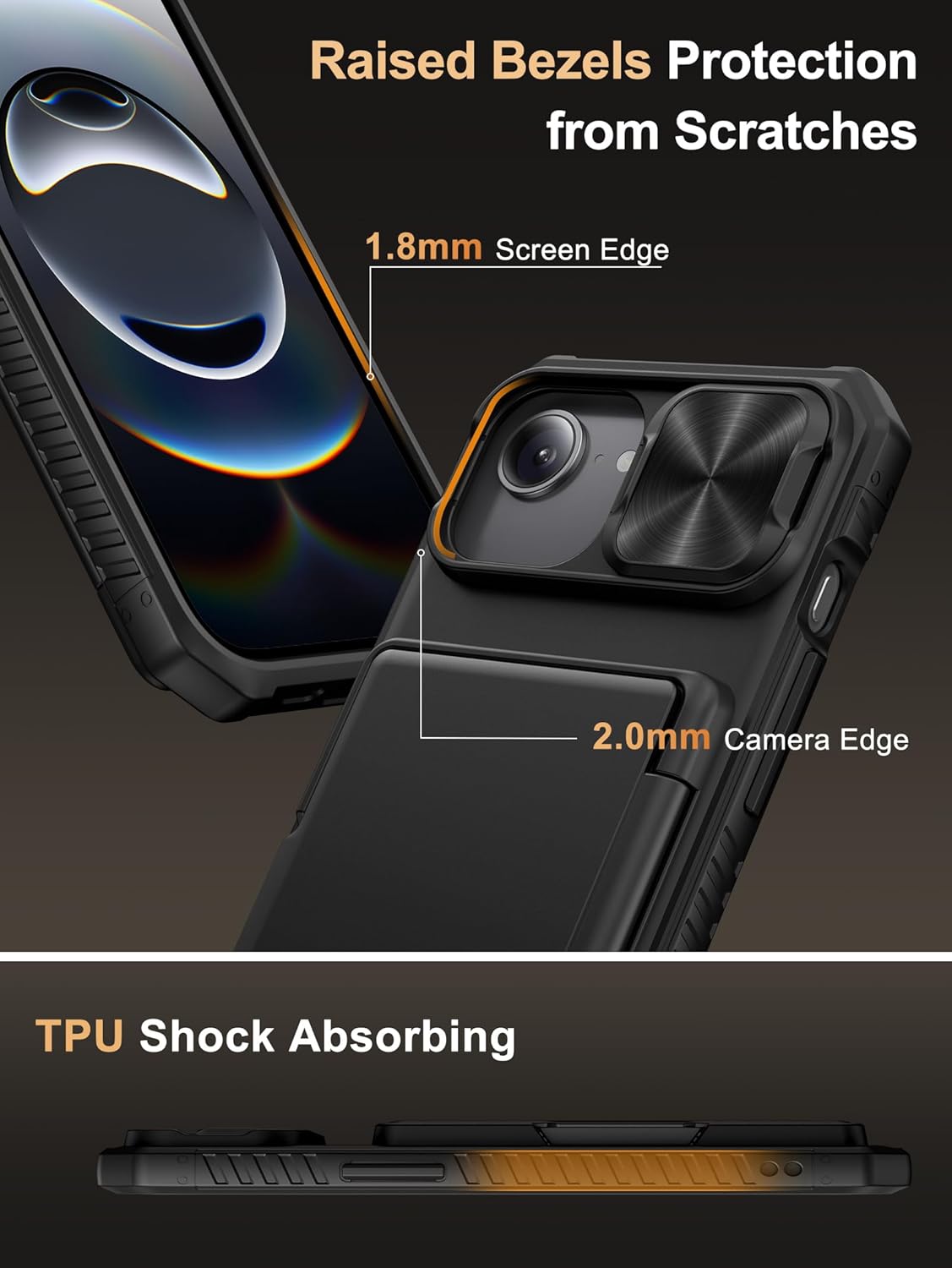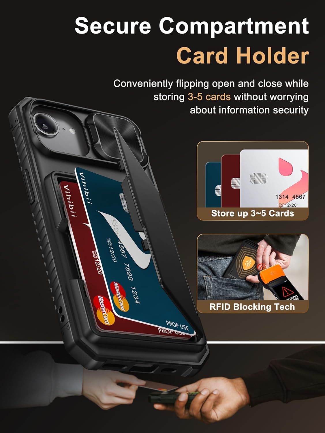 <br>【ONLY Compatible with iPhone 16e】The wallet case is only compatible with iPhone 16e 2025 5g 6.1 Inch. [2025 Upgraded Version] (Please check the phone model carefully before purchasing). Vihibii has a professional design and after-sales service team as we are responsible for our products and our customers<br>【Wallet-Card Holder-Storage】Our iphone 16e case has a storage space on the back design. You can safely store a small amount of cash or 4-5 cards according to the thickness of the card so that you can carry your credit cards, ID or a little cash when you're on the go, without a bulky wallet. With newly upgraded structures, the card holder hinge position is locked in the center of the phone case, refusing to fall off, which is more secure protection for your cards and cash<br>【Upgraded RFID Blocking Tech】 Vihibii case for iphone 16E adds RFID Blocking technology, which protects your card or credit card information from theft by blocking RFID signals with innovative blocking material and preventing unauthorized scanners. You can enjoy yourself while traveling and shopping without worrying about information security problems<br>【Sliding Camera Lens Protection Cover】The newly designed sliding camera protective cover is 2mm thick and the sliding rail is sensitive. When you don't need to use the camera, just slide the cover for one second to cover the camera lens to Protect your iphone 16E phone lens from scratches and damage<br>【Military-Grade Drop Protection】(1)The edges of the case are made of silicone combined with the airbag shock-absorbing structure design at the four corners, effectively resolving strong external impacts and giving your phone a real sense of security. (2)The bezel is slightly higher than the screen by 2mm, preventing the screen from entering direct and intimate contact with the ground when the phone is dropped from the front