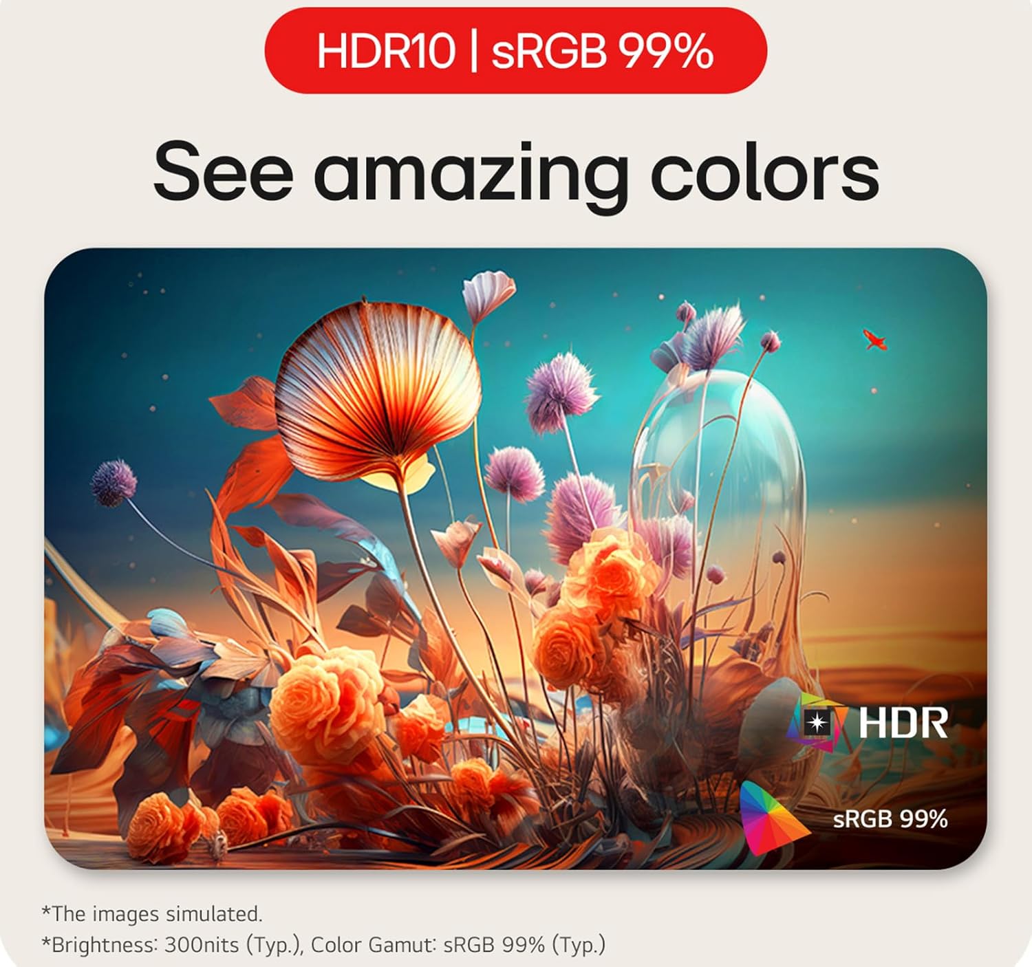 See Amazing Colours ( HDR10 with sRGB 99% (Typ.) ) HDR10 with sRGB 99% (Typ.)HDR10 with sRGB 99% (Typ.)