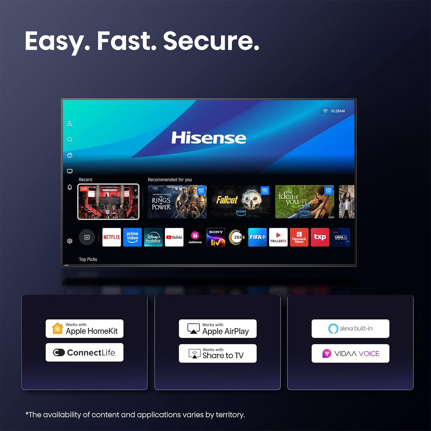 <br>Resolution: QLED | 4K Ultra HD (3840 x 2160) | Refresh Rate: 60 hertz | ALLM | VRR<br>Connectivity: 3 HDMI 2.1 ports to connect set top box (HDMI3 eARC supported) | 2 USB 2.0 port to connect hard drives and other USB devices | Built- in Dual Band WiFi (2.4G/5G) | Bluetooth 5.0 | 1 Ethernet RJ45 | 1 Composite (AV) Inputs | 1 Optical digital audio output (SPDIF) | 1 Audio (L/R) Input | Common Interface (CI+) Supported | 2 RF Tuner<br>Sound: 48 Watts Speakers Power | Dolby Atoms | Sound processing: Dolby MS12, DTS X | NICAM | MPEG-H | User equalizer | Other sound enhancement / features: TV Mode, EzPlay 2.0, WiSA SoundSend<br>Smart TV Features: AI Picture, AI Scenario | VIDAA TV | Built-in Vidaa Voice | Built-in Alexa | Screen Sharing | Airplay2 | Content Sharing | VIDAA Store | Sleep timer | VIDAA App control | HDR Game Mode | VRR & ALLM | Game mode PLUS | Game Bar | Supported Apps: Netflix, Youtube, Prime Video, JioHotstar, SonyLiv, Zee5, SunNXT, Xstream Play, Apple TV, CrunchyRoll, TravelXP<br>Display: QLED Colour | Quantum Dot Technology | AI 4K Upscaler | AI HDR Upscaler | 8 Bit + FRC color depth | 4000:1 Native contrast ratio | High brightness | Dolby Vision | HDR 10+ | 4K HDR Immersive | Wide color gamut | Filmmaker mode | MEMC<br>Warranty Information: 1-year warranty from date of purchase on the television set and 1-year warranty on the remote control provided by brand. Warranty claims can be processed using the Amazon e-invoice