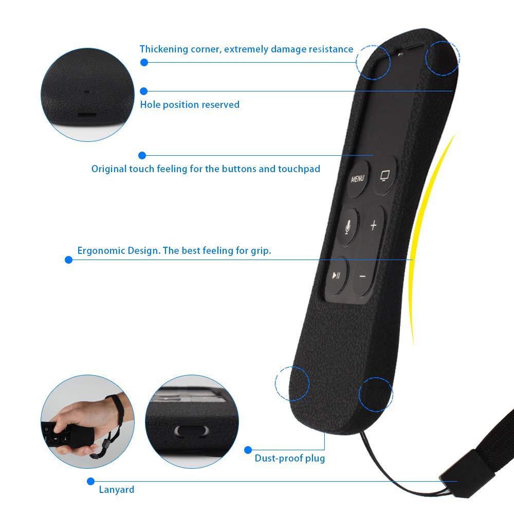 <br>100% fit the new APPLE TV 4K / 4th Gen Remote ( Siri Remote control ), the seismic prevention fell, all-round protection, and NO impact on touch pad operations.<br>Characteristic dustproof design, charging port won't be polluted by the dust or powder.<br>Ergonomic Design: Durable and soft silicone,adds great grip and drop protection.<br>Exclusive fence gasbag Design + Free Handle strap, protect your remote at all times.<br>An included wrist strap is provided that helps prevent accidental drops or releases when using the remote with motion controls.