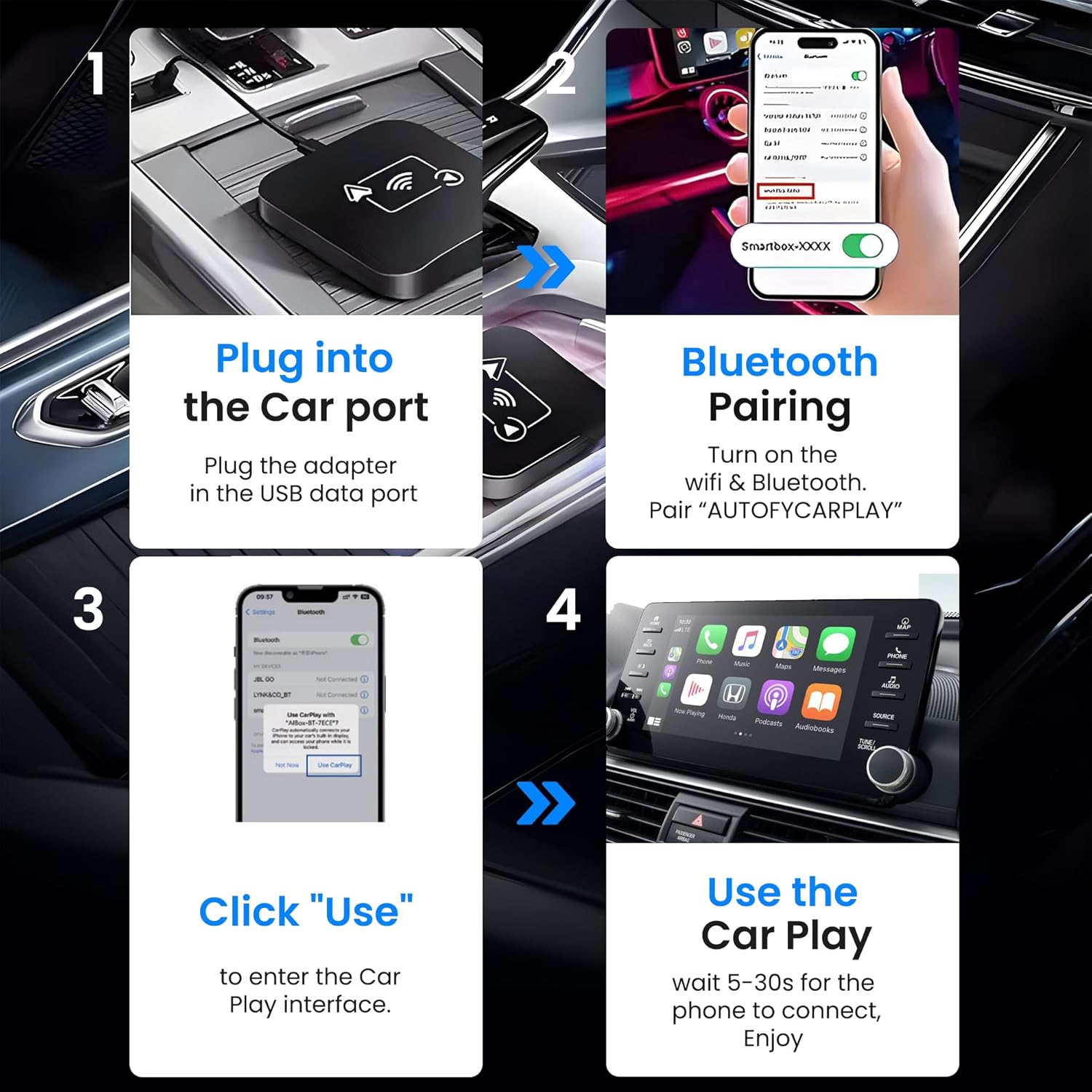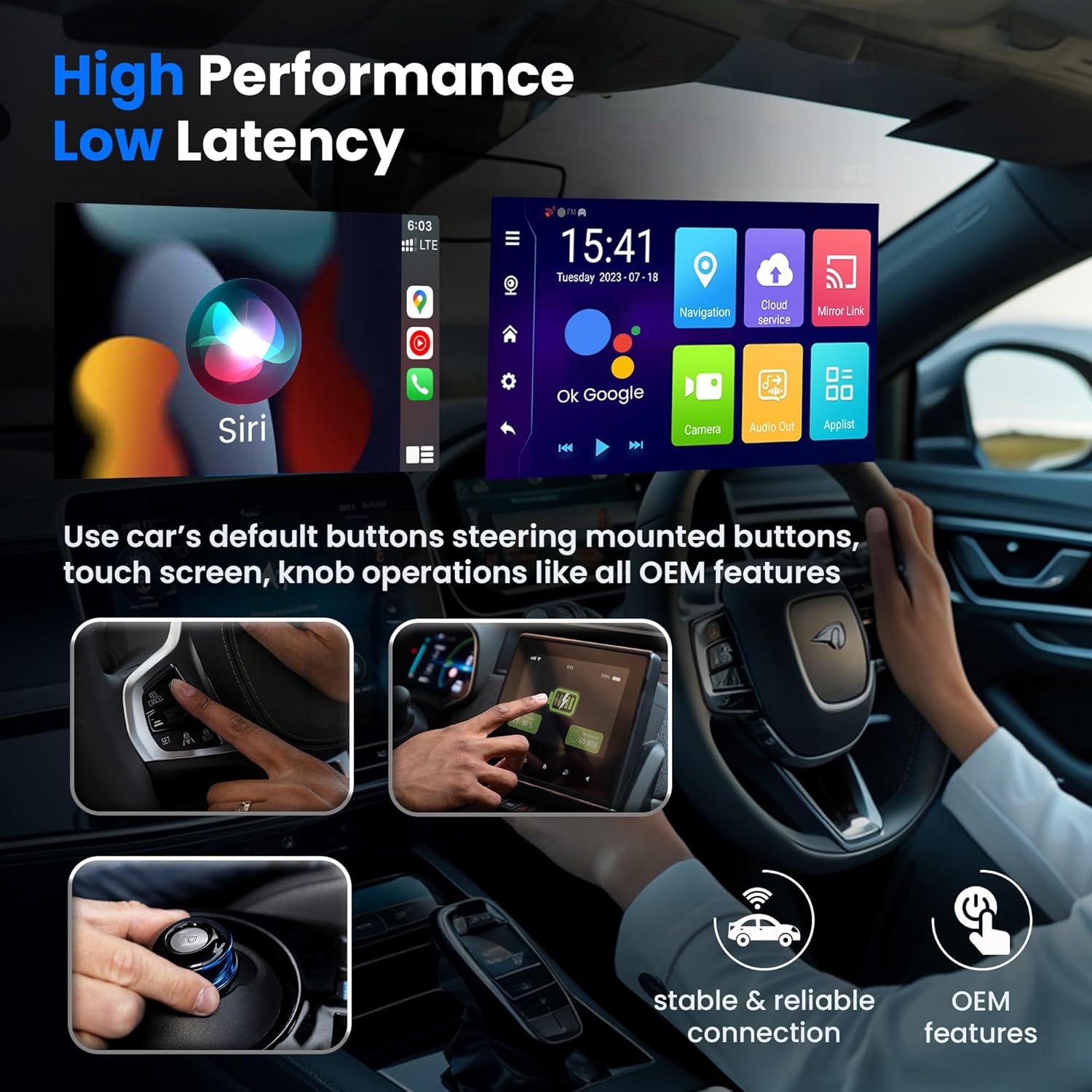 <br>[24 MONTHS WARRANTY - WIRELESS ADAPTER for APPLE CARPLAY & ANDROID AUTO] - Autofy K1F Wireless Apple CarPlay & Android Auto Adapter converts your wired setup completely cordless. Enjoy Navigation, Calls, Siri, Ok Google, Music playback all without connecting charging cable. Autofy's wireless adapter car accessory has 60% faster connection & reconnects automatically. So just connect and forget. Comes with 24 Months warranty.<br>[60% FAST CONNECTION & AUTO RECONNECT] - powered with Bluetooth 5.3 & 5.8 GHz Wifi band ensuring your phone stays connected . Autofy's K1F wireless carplay adapter car accessory has lightning fast reconnection time. Just plug in the wireless adapter & pair once with your Android or iOS device for a smooth & flawless experience. Enjoy a stable & reliable connection with minimal delays or interruptions, even in challenging environments like underground parking lots or crowded areas.<br>[PLUG PLAY DEVICE WITH FAST DETECTION & WORKS WITH ALL DEFAULT CAR BUTTONS] - When car engine is turned ON, powerful chip inside quickly starts adapter & 5.8GHz Wifi detects your phone even if it is in your bag, pocket etc. Autofy's K1F allows you to use steering mounted buttons, voice control, touch screen, knob operations like all OEM features. No Apps / System Drivers needed. Please ensure your phone forgets Bluetooth/WiFi connections with the car's infotainment system before starting.<br>[COMPATIBILITY] - Autofy's K1F works with most car models having factory fitted wired Android Auto OR Apple CarPlay. K1F supports iOS 10 & Android 11.0 and above. Connect with our awesome customer support team if you face any issue during setup (Details mentioned on MRP Label & Product Manual both). K1F Might not work with some aftermarket stereos hence we suggest to connect with us in case of setup issues.<br>[HIGH PERFORMANCE LOW LATENCY] - upgrade from wired Carplay & Android auto to a fully wireless one. Reduce charging cable, charging port wear & tear and have a wire free experience. This car interior accessory has powerful chip to ensure minimal lags giving you high performance during rides. Enjoy low latency navigations, music playback & more with Autofy's K1F wireless adapter.