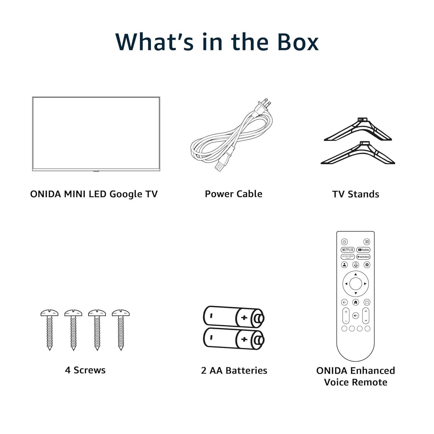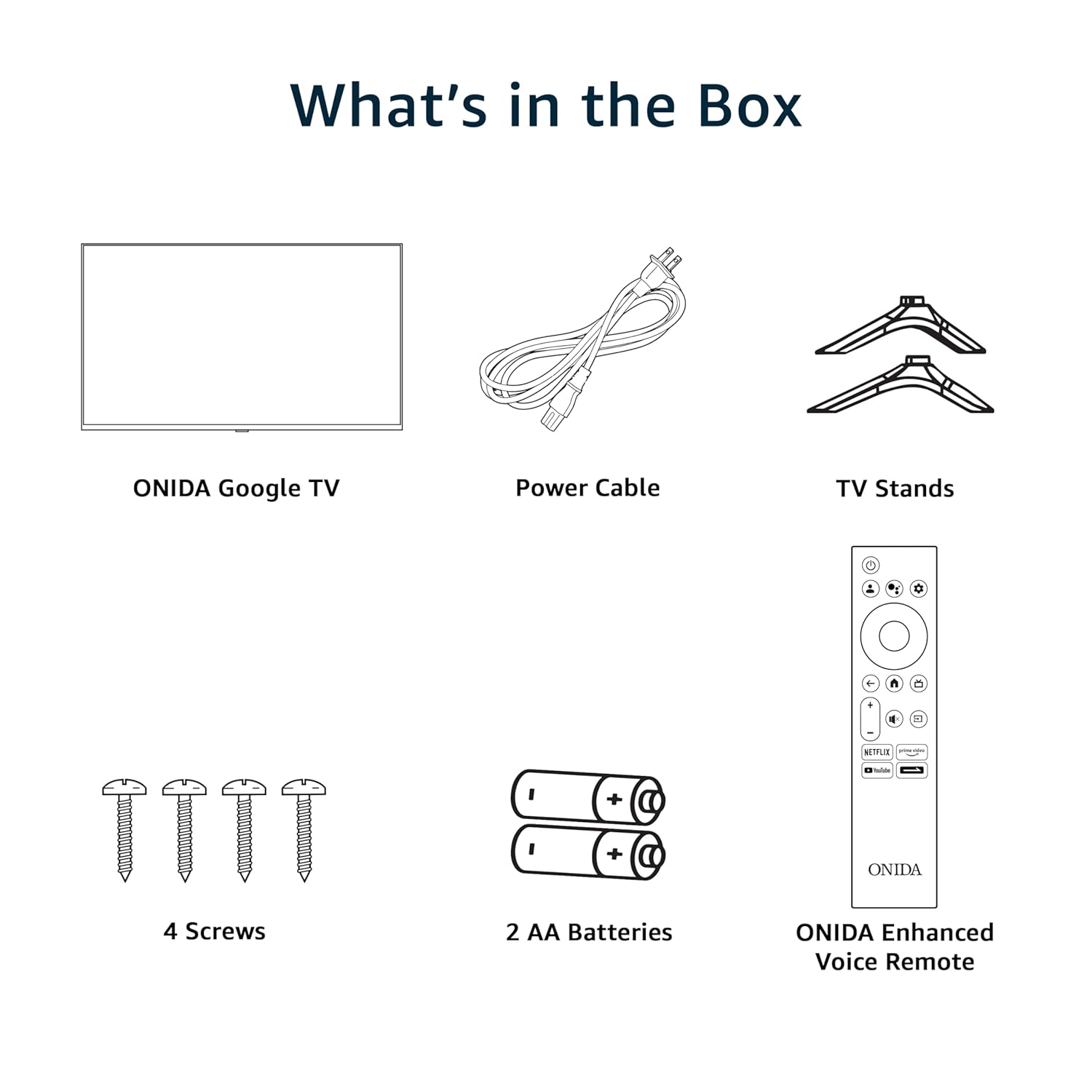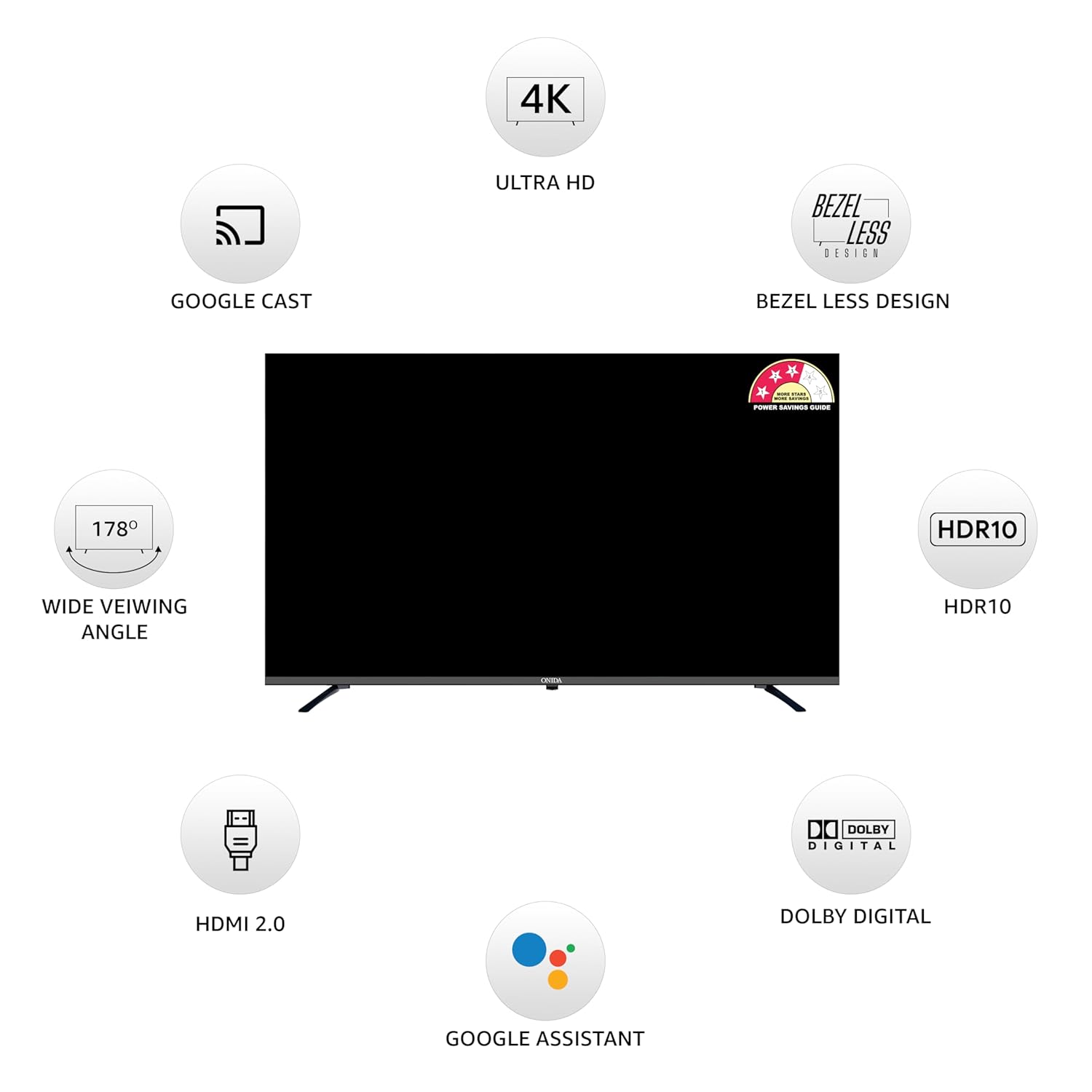 <br>Resolution: 4K Ultra HD (3840 x 2160) | Refresh Rate: 60 Hertz | 178 Degree wide viewing angle<br>Connectivity: 3 HDMI ports to connect set top box, Blu Ray players, gaming console | 2 USB ports to connect hard drives and other USB devices<br>Sound : 20 Watts Output | Surround Sound | Dolby Audio | Equilizer<br>Smart TV Features: Google TV, Watchlist, Voice Search, Google Play, Google cast Built-In, Netflix, Amazon Prime Video | Supported Apps: Netflix, Amazon Prime Video, Disney+ Hotstar, Sony Liv, Zee5,<br>Display: 4K HDR 10 | Live Colour | Wide Viewing Angle | Pixa Visual Engine I Eye Protect Plus<br>Warranty Information: 1 year standard manufacturer warranty by ONIDA from the date of Purchase