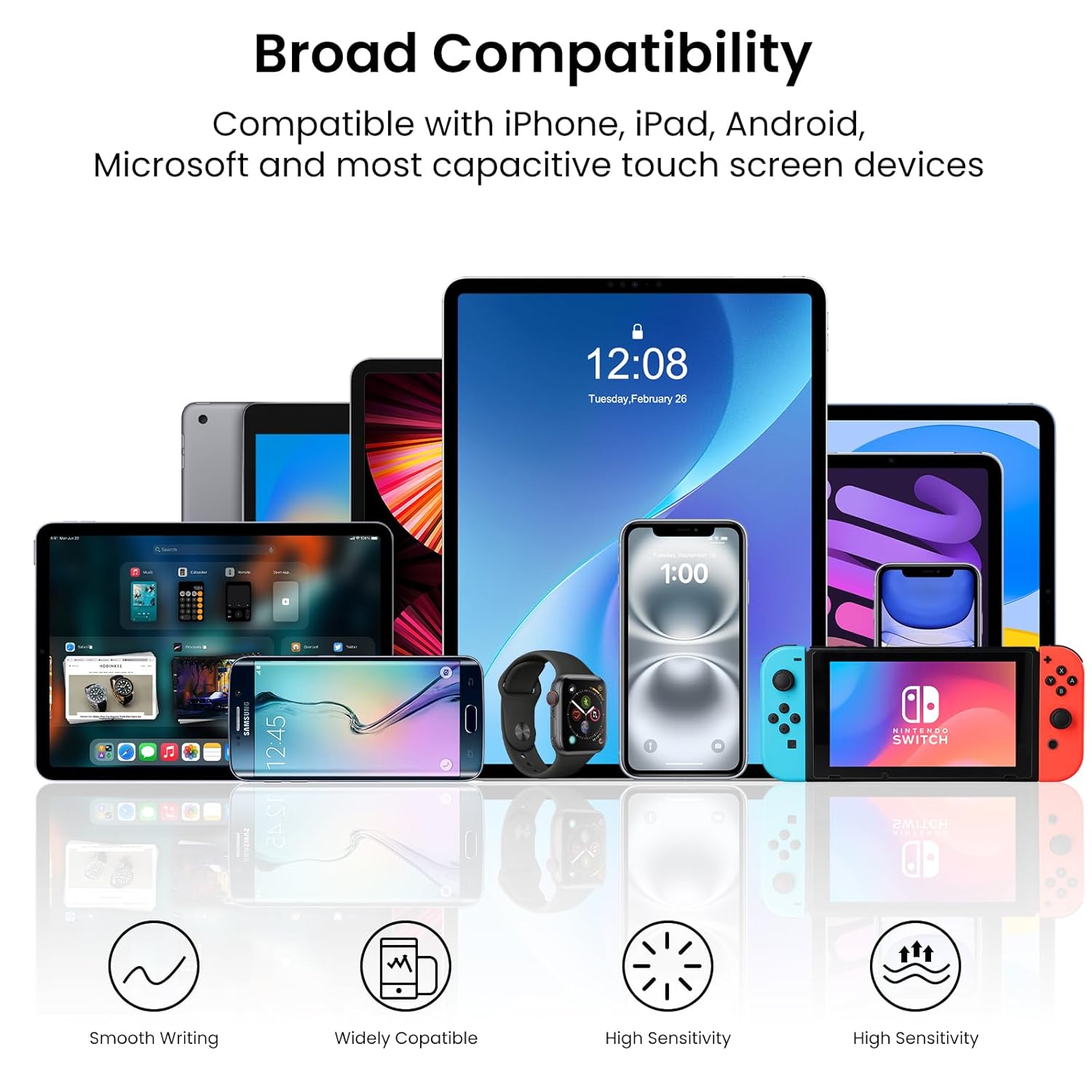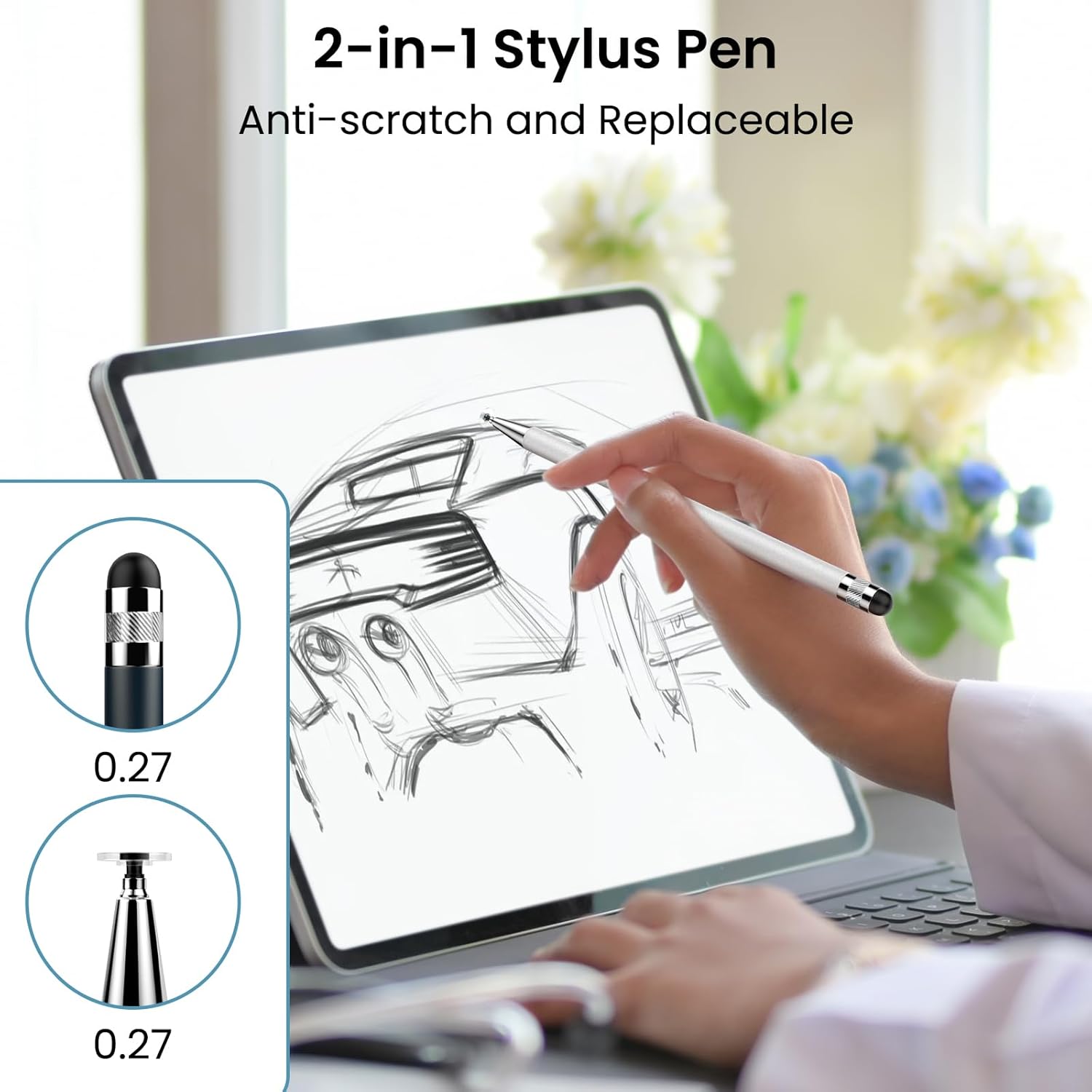 <br>【Upgraded 2-in-1 Stylus】: The size of the Disc tip and the structure of the connection are optimized. When writing notes, it is recommended to use a transparent disc tip so that there will be no interruptions.This 2-in-1 stylus pen meets various needs in your daily life, whether it's clicking icons, writing, drawing, or playing games, it can handle them all with ease.<br>【Highly Sensitive and Accurate】: The disc tip is transparent which allows visibility of the contact point, making it highly accurate and responsive. 180° flexible writing angle for comfortable using. You can get more smooth writing or painting experience, no lag, no interruption, no screen scratching.<br>【Disc and Rubber dual Tips design】: The two different- tips(0.27'' & 0.27'') are smooth and responsive, made from high-quality material with excellent wear and aging resistance. The soft rubber tips won't scratch screens or leave as many fingerprints as fingers. Ideal for those with long nails or larger fingers, perfect for browsing screens,, and playing games.<br>【Wide Compatibility】: StylusHome styluses are universally compatible with all capacitive cell phones, tablets, touch screen laptops & PC, e-Reders, such as Apple iPad/ iPhone/ iPod/ Tablet/ / kindle & more.<br>【Easy to Use & Replaceable】: No battery or bluetooth needed, simply unscrew the pen cap to use the disc tip and use dual rubber tips directly.2 tips are replaceable and finish the replacement process within seconds. Package contains 5* stylus, 8* replaceable rubber tips, 2* disc tips, effectively extending the lifetime of the stylus.<br>【Multiple styluses】: Can be shared with multiple friends for common use, or placed in multiple places for easy access, with different colors for different moods.